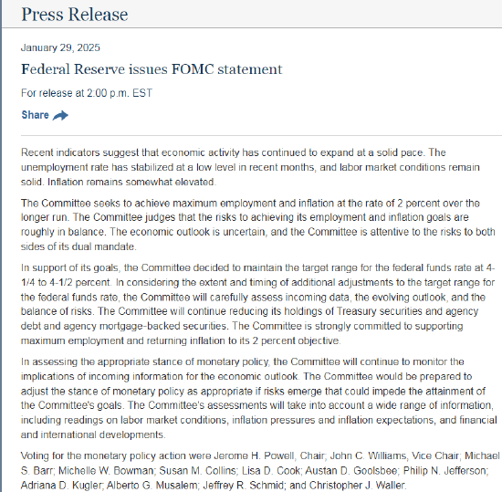 北京时间1月30日凌晨3:00美联储宣布,一致投票决定维持利率不变,删去有关通胀朝目标取得进展的表述,并表示失业率稳定在低水平,劳动力市场状况保持稳固;取代先前声明中提及的情况已经缓和。